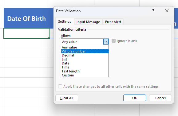 In the Settings tab, choose the type of validation (e.g., whole number, decimal, list, date, time, text length, or custom).